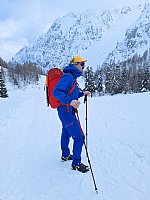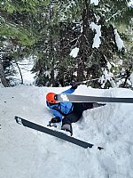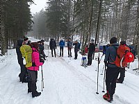 Sobotni dan smo po zboru in nekaj besedah začeli s hojo na koncu splužene ceste pri naši nastanitvi in se odpravili mimo slapu Rinke na Okrešelj. Temperature so bile še kar visoke, zato je bil sneg povsem moker (strokovni terimin "prescan") in se do Okrešlja ni bistveno spremenil. Prvi postanek smo naredili na jasi pri zavetišču GRS in se seznanili z lavinskim kompletom ter prižgali in namestili žolne. Nadaljevanje proti Savinjskemu sedlu je bilo za prvega v karavani naporno, saj se je sneg globoko prediral, zaradi naše številčnosti pa so zadnji pohodniki že hodili po avtocesti in se spraševali, zakaj gre tako počasi, ko pa je tako fina gaz:) Z naraščajočo nadmorsko višino je sneg postal bolj suh in lahek kar nam je prav prišlo za naslednjo aktivnost. Nejc nas je ustavil pri strmem pobočju, kot nalašč za učenje hoje s cepinom in ustavljanja v primeru zdrsa. Po debeli uri gaženja in metanja pod breg smo si izza hlač in vratu očistili sneg ter nadaljevali v smeri Savinjskega sedla. Na vetrovnem vrhu nekaj selfijev in nazaj v zavetje pod vrhom, kjer sta nam Nejc in Blaž predstavila analizo snežne odeje. Ura je bila že pozna in sestop v dolino je bil hiter. S čelkami na glavi smo pricapljali do koče minute pred večerjo.