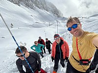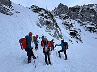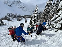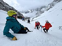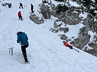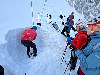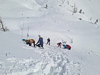 Zaključili smo z vajo reševanja zasutih v plazu, kjer so udeleženci preverili svojo sposobnost iskanja, sondiranja in kopanja, nato pa še individualno vadili iskanje skrite žolne. Ob koči je vikend sklenil še ponovljen trening ustavljanja s cepinom.
