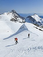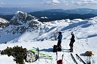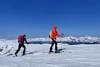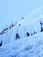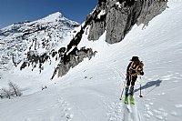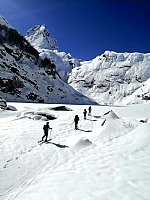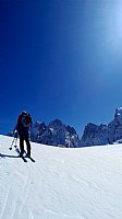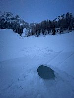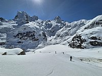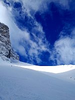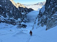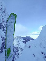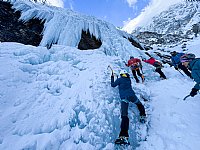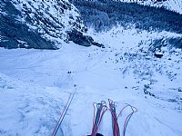 Udeleženci so se nato razdelili v naveze in izvedli vse prikazane načine varovanja. Sledil je spust na dva cepina, kjer je vsakdo dobil občutek, kako funkcionira sidrišče in kako se varno spusti po vrvi v snežnih pogojih. Demonstrirali smo tudi spust na snežno gobo in uporabo deadman-a, ki je v nekaterih pogojih edina opcija za varno sidrišče.