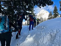 Po razlagi je sledila praksa – vsak udeleženec si je sam izdelal T-sidrišču v snegu in ga preizkusil, nato pa smo se lotili vertikalnega sidrišča, kjer se vsedeš in varuješ partnerja z vrvjo znotraj sidrišča. Razložili in demonstrirali smo različne opcije varovanja v snegu, vključno z varovanjem drugega v navezi v različnih orientacijah (obrnjeno navzgor, navzdol, ter varovanje napredujočega), ki so ključne veščine alpinistične vrvne tehnike.