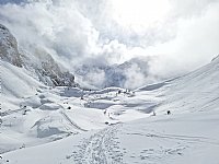 Petnajsterica se je – v precej podobni postavi kot lansko leto – po treh mesecih znova zgrnila v Logarski kot. V hudi odjugi smo prvi dan namenili osnovam zimskega gorništva, spoznali opremo in njeno uporabo, se spoznali z različnimi vrstami snega in zimskega terena nasploh, se učili hoje v različnih razmerah in nakloninah, se poskušali ustaviti s cepinom ali brez njega, preverjali sestavo snežne odeje in njeno stabilnost. Medtem smo v 8 urah na terenu prispeli na Savinjsko sedlo in se z nočjo vrnili na večerjo, po njej pa še v teoriji obravnavali pristop k zimskim turam, pripravo nanje, opremo, nevarnosti, ki nam pretijo, prav tako tudi etiko.