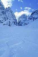 Meglen nedeljski dan se je začel z obilnim zajtrkom in ob 8:30 je karavana spet krenila proti Okrešlju. Ponoči je ohladitev povsem spremenila snežno podlago - že na začetku strme poti pri slapu Rinka smo nataknili dereze saj je bila pot pomrznjena in spolzka. Pripraskali smo do Okrešlja ter nadaljevali proti Turskem žlebu. Megla je bila gosta in ni ji bilo videti konca, nakar se kar naenkrat pretrga in znajdemo se v objemu čudovitih, v sneg odetih gora. Na pobočju pod Turskim žlebom izvedemo plazovno delavnico, kjer nam Blaž in Peter v sneg zakopljeta 2 žolni in ju z Nejčevo pomočjo tudi "rešimo". Po delavnici se Blaž in Jakob vrneta v megleno dolino plezat slap Palenk nad hotelom Plesnik, ostali pa nadaljujemo proti žlebu in si na vstopu, ko podlaga postane trša, nadenemo dereze, v roko pa vzamemo cepin. Že uporabljamo znanje pridobljeno včeraj in se cik-cak vzpenjamo vse višje in višje ter občudujemo mogočne stene, ki se dvigajo okoli nas. Čvekanje nekoliko potihne, malo smo zadihani, predvsem pa se zavedamo, da to ni več navaden sprehod. Vsi osredotočeni na svoje korake se zbrano povzpnemo do »ustja« Turskega žleba in tam nas pričaka zimska pravljica. Pogled se odpre na kamniško stran, kjer nas toplo sonce prestavi v povsem drug svet. S soncem obsijani vrhovi in pobočja so v zimski preobleki res nekaj posebnega. Z debelimi očmi se privajamo nove kulise in pogledujemo proti vrhu Turske gore. Nadaljujemo izjemno previdno, saj je pot na vrh nekoliko izpostavljena. Kljub težjim mestom vsi brez težav stopimo na vrh 2251 metrov visoke gore. Nagrajeni smo za trud, takšnih razgledov se ne naveličaš. V dolinah morje megle, iz katerega se dvigajo s soncem obsijani beli vrhovi, ki me vabijo, da jih pridem pogledat od blizu. Seveda po tihem že dodajam nove ture v vrečo želja. Žal pa je ura že pozna zato bo treba nazaj v dolino. Ko je za nami zahtevnejši del sestopa, si pod Turskim žlebom nekateri snamemo dereze in se po riti drajsamo kakih 300 metrov. Leti kot sneta s'kira, sam vmes potreniram tudi ustavljanje s cepinom. Dobri dve uri dolg sestop zaključimo pri koči Logarski kot. Eni se odpeljemo domov, drugi pa na pico in analizo ture v Luče pr'Lampi.