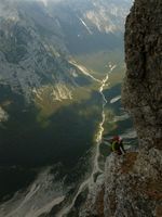 Neke precej oblačne nedelje sva se podala na Jezersko in splezala smer Ekar-Jamnik. Smer ni ravno lepotica, je pa zelo solidna. Detajl je težak, zahteven gib. Naju je pa na vrhu za nagrado počakalo sonce. Doma sva bila že za kosilo.