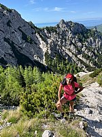 Za povratek se odločiva izbrati pot ob obali, ki je malo slabše označena. Pot se nadaljuje s kratkimi vzponi in spusti, vsak spust pa nas pripelje do nove samotne plaže. Nekatere so široke, nekatere ozke, peščene, spet druge kamnite in težje dostopne, vse pa so mamljive za hiter skok v morje. Seveda ravno pravšnjo temperaturo morja tudi izkoristiva in se osveživa v hladnem morju. Poleg skrivnostnih plažic naju ob poti spremlja pogled na nenaseljen otok Prvić. Tu in tam je potrebno pogledat kam stopiš, saj je Iris skoraj pohodila kačo, ki se je na srečo bolj ustrašila kot Iris in kot rešitev pametno izbrala pobeg namesto ugriza. Še sreča. Nisem še videl kače, ki bi tako urno skočila med skale v bližini. Proti koncu se pot ob obali združi s spustom čez kanjon Verženica na lepi, a ne več tako samotni plaži, za katero se nahaja borov gozdiček. Od tu naprej je pot bolj uhojena in mestoma že zelo zlizana, saj nas mimo plezališča Buncoluka pripelje do istoimenskega kampa. Sledi še zadnje presenečenje – res strm vzpon ob kampu in nato še povratek do parkirišča nekje v Baški.