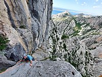 Portafortuna je meni zelo ljubo plezališče in komaj sem čakal, da ga spet vidim od blizu. Po hitri kavici ob morju se odpraviva na parkirišče Portafortune in, verjetno zaradi Korone, dobiva celo parkirno mesto v senci. Ob 10ih sva že pod steno in pripravljena na akcijo. Prevroče ni, pa še prijetno pihlja. Vrhunsko. Ogrejeva se v 5kah in seveda je potrebno vsaj 1x na obisk splezati smer Forever young (6a), ki je res dolga in uživaška. Iris v prvo ni uspelo, zato se odloči, da poskusi še enkrat. Jaz se prestavim v sosednjo smer Flower power (6c+), kjer lani nisem imel za burek v detajlu, letos pa…sprehod. Vse smeri so dolge 30 metrov in več. V kar nekaj smereh je potrebno prevezovanje, tako da čas hitro mineva. Iris si medtem pribori večno mladost v smeri Forever young. Poln energije upam, da pridem na vrsto še za smer Joke about summer (6c), ki je bila tako kot lani celoten dopust vseskozi zasedena. Na srečo so bili v njej zelo prijazni hrvaški plezalci in so mi dovolili, da poskusim smer med njihovo pavzo. Smer je res čudovita, vse je šlo gladko, pa še prijazni Hrvati so se odločili navijati, čeprav se ravno ne poznamo. Po preplezani smerci se odločiva, da sva dovolj lačna, da greva v apartma in si ogledava Baščansko ploščo v Jurandvoru.