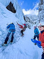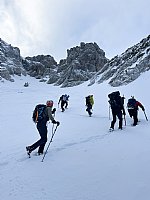 Udeleženci so se nato razdelili v naveze in izvedli vse prikazane načine varovanja. Sledil je spust na dva cepina, kjer je vsakdo dobil občutek, kako funkcionira sidrišče in kako se varno spusti po vrvi v snežnih pogojih. Demonstrirali smo tudi spust na snežno gobo in uporabo deadman-a, ki je v nekaterih pogojih edina opcija za varno sidrišče.