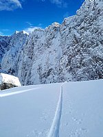 Dobre razmere tekoče sezone sva z Matejem zamudila in po nekaj turnih smukah sva želela še kaj drugega kot samo smučati s hriba. Slovensko sva imela oba v mislih te dni. V četrtek se je kazalo vremensko okno, na hitro sva uredila zadeve v službi, doma. Ob treh zjuraj sva štartala proti Gorenjski. Upanje, da se bova pripeljala vsaj do Peričnika je splahnelo pri tabli konec Mojstrane, kjer sva parkirala. Še v temi, ob petih, sva jo na smučehi mahnila do pod Stene, si oprtala smuči in zagazila, zaplezala... Kljub gaženju od kolen pa gor, nisva niti pomislila, da bi obrnila. Želja je bila neizmerna, pogled je težil samo navzgor. Smer je v celoti lepo zalita, kakor vsa dolina. Na prave razmere bo treba pa malo počakati. Plezala, garala sva kar sedem ur, nato pa sva oddrsala proti Staničevi koči in naprej v dolino, za Cmirom. Smuka je bila na momente odlična - puhec, kjer severnik pretekle dni ni dosegel in napravil skorjice.