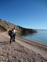 Za povratek se odločiva izbrati pot ob obali, ki je malo slabše označena. Pot se nadaljuje s kratkimi vzponi in spusti, vsak spust pa nas pripelje do nove samotne plaže. Nekatere so široke, nekatere ozke, peščene, spet druge kamnite in težje dostopne, vse pa so mamljive za hiter skok v morje. Seveda ravno pravšnjo temperaturo morja tudi izkoristiva in se osveživa v hladnem morju. Poleg skrivnostnih plažic naju ob poti spremlja pogled na nenaseljen otok Prvić. Tu in tam je potrebno pogledat kam stopiš, saj je Iris skoraj pohodila kačo, ki se je na srečo bolj ustrašila kot Iris in kot rešitev pametno izbrala pobeg namesto ugriza. Še sreča. Nisem še videl kače, ki bi tako urno skočila med skale v bližini. Proti koncu se pot ob obali združi s spustom čez kanjon Verženica na lepi, a ne več tako samotni plaži, za katero se nahaja borov gozdiček. Od tu naprej je pot bolj uhojena in mestoma že zelo zlizana, saj nas mimo plezališča Buncoluka pripelje do istoimenskega kampa. Sledi še zadnje presenečenje – res strm vzpon ob kampu in nato še povratek do parkirišča nekje v Baški.