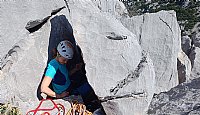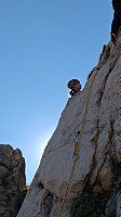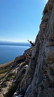 V petek sva po obilnem zajtrku kar zgodaj odšla v plezališče, saj sva želela pozno popoldne izkoristiti za uživanje ob morju. Odločila sva se, da ponoviva smeri, ki so nama res lepe in v njih uživava. Pozno popoldne se vseeno odločim, da bi poskusil zame novo smer Fire walker (6c+). Začetek ni bil težaven, vse je šlo super, dokler nisem zdrsnil na koncu detajla in je šel »onsajt« po gobe. Kljub padcu sem si smer pogledal potem do vrha in po krajši pavzi je v drugo šlo kot po maslu. Hitro pospraviva opremo in oddrviva proti morju.