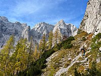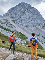 Odpravimo se nazaj proti parkirišču, ki je bil sedaj že skoraj poln. Z Rokom opazujeva avte in sva presenečena, da imajo vsi avti neke plezalne nalepke, da vsi iz avtov vlečejo blazine…medtem Iris raje uživa v lepih pogledih na okoliške gore. Zelo lep je bil predvsem pogled na še vedno zasneženo Skuto.
