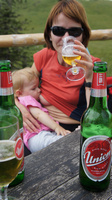 Odpravimo se nazaj proti parkirišču, ki je bil sedaj že skoraj poln. Z Rokom opazujeva avte in sva presenečena, da imajo vsi avti neke plezalne nalepke, da vsi iz avtov vlečejo blazine…medtem Iris raje uživa v lepih pogledih na okoliške gore. Zelo lep je bil predvsem pogled na še vedno zasneženo Skuto.
