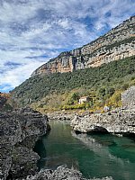 No, najin prvi plezalni dan, in vsi ostali, se začne v kanjonu Cijevna. Nad to reko se dvigajo super stene, opremljenih je že kar nekaj sektorjev. Zapeljeva se do vasi Lovka, od parkirišča je 10 minutk hoje pod steno. Ker je vremenska napoved malo mešana, dež, sonce, je stena deloma mokra. Tako imava prve štiri dni malo manjši izbor smeri.