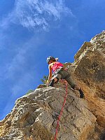 Skala na začetku še ni tista prava - dolomitska, ki jo obljubljajo opisi smeri, zato sem previden in kar vesel, da Nejc spleza prvi težji raztežaj. Tudi kamin, ki je po navadi moker, pripada njemu. Kljub temu, da ima na ramenih ruzak, kamin zlahka zmore in tudi sam nimam nobenih težav. Potem pa se stena zares postavi pokonci, z vertikalo pa se kvaliteta skale popravi. Sedaj sem že vplezan in lahko se spopadem s težjimi raztežaji in kar vesel sem, da pridem na vrsto za vse najlepše in tudi najtežje. Nejc pa dobi tiste, ki so bolj orientacijsko zahtevni. Plezava tekoče in kar prehitro sva v lažjem svetu. Razveževa se in nadaljujeva proti vrhu smeri, ki se zaključi na vrhu raza pred polico, ki prečka celotno ostenje in je tudi najlažja za sestop z gore. Odločiva se za raziskovanje in plezava naprej, da bi prišla čisto na vrh. Ko že misliva, da sva ga dosegla, pred nama zazija prepad in na drugi strani strma stena, ki pripelje na pravi vrh. Nejc je še pripravljen na avanturo, sam pa malo bremzam in ga pregovorim, da se vrneva na izstopno polico. Splezava kakšnih 150 metrov navzdol in po polici pobegneva iz stene. Sestop je res divji in prav uživam v vsakem metru, ko se približujem dolini. Pot mi seveda olajša moj sine, ki nosi večji del opreme in meni prepusti le eno od vrvi. Ko prideva pod ostenje, se potrudi še do ruzaka, ki sva ga pustila pod smerjo in mi prinese palice, ki mi še olajšajo sestop. Med povratkom dobro vidiva v smer, kjer opaziva tudi Edvina s soplezalci. Ravno so v orientacijsko najbolj zahtevnem delu, kjer je prej Nejc tako dobro rešil uganko. Zakričiva jim, da je potrebno plezati najprej malo navzdol in potem čisto vodoravno na raz in jim tako pomagava, da se lažje rešijo iz težav.